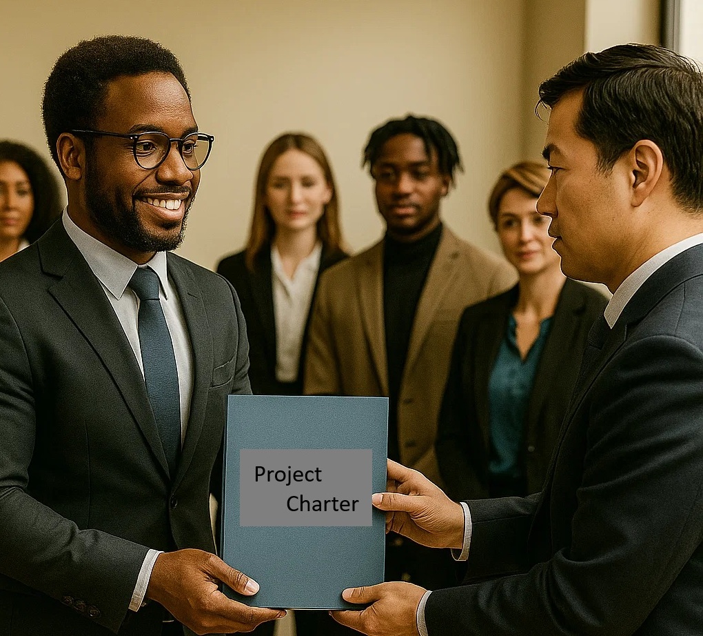 This image symbolizes the closing ceremony of the Initiating Process, where the project charter is handed off to the planning team, who then begin the formal planning phase.