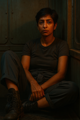Her shirt clung in streaks of effort, salt and stubbornness stitched into the seams. Laces undone. Knees up. One foot tapping to no rhythm, the other pressed against the wall like she was holding the system together with just that heel.